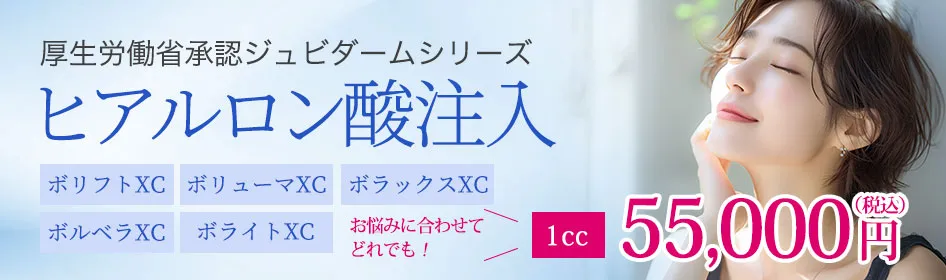 ヒアルロン酸は体内に元々ある保水成分で、注入後は徐々に体内に吸収されていき身体に残る心配がありません。当院では、日本の厚生労働省承認の製剤であるジュビダームビスタを使用しています。