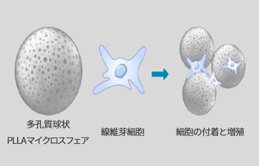 多孔質の球状構造を特徴とし特許済みの技術でヒアルロン酸と結合しているのでこの多孔性により粒子が安定し細胞増殖を促進しコラーゲン生成を促進してくれます。ポリ乳酸のボリュームアップ及びコラーゲンの生成、ヒアルロン酸は保湿や痩せた細胞をふっくらさせる効果があります。