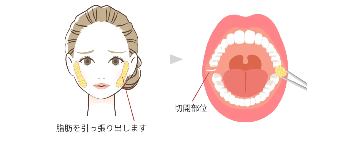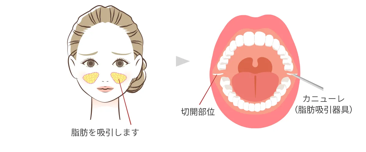 施術は、口腔内から約5mmほどの小さな切開を行い、専用器具で脂肪を丁寧に摘出します。皮膚の表面に傷が残らず、腫れや内出血が最小限に抑えられるのが特徴です。