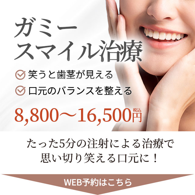 ガミースマイルとは、笑った時に歯茎が目立つ状態です。笑うのをためらったり、人との会話がおっくうになったりメンタル面での問題を抱えることにもなりかねません。 ボツリヌストキシン注射なら簡単に唇を上げる筋肉の働きを弱めることができます。その結果、歯茎が目立たなくなります。